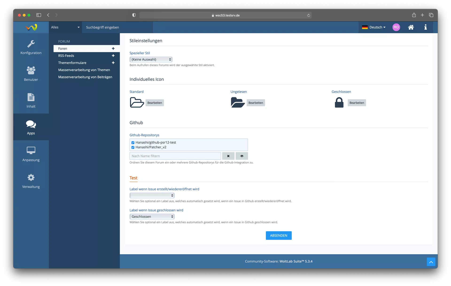 Es besteht die Möglichkeit ein Forum mit einem oder sogar mehreren Repositorys zu verknüpfen. Wenn mehrere Repositorys verknüpft sind, wird beim Issue erstellen eine Auswahl der Repositorys angezeigt.