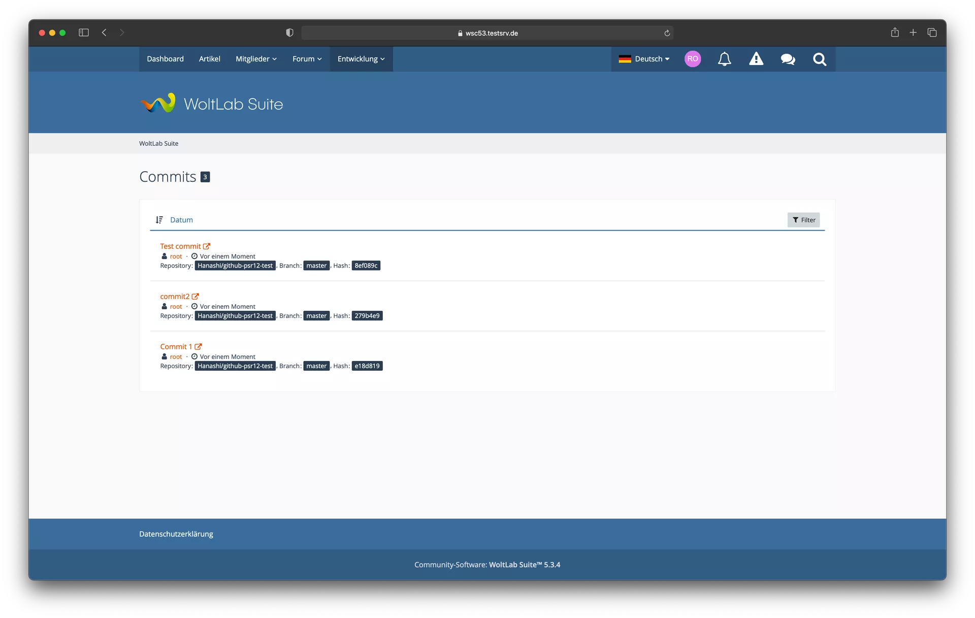 Dieses Plugin bietet von Haus aus die Möglichkeit eine Überssichtsseite von Commits. Wenn du in deinem Repository Dateien änderst, werden die Commits automatisch via Webhook in deiner Datenbank gespeichert und auf der Übersichtsseite angezeigt. Zusätzlich kann auf dieser Überssichtsseite nach bestimmten Repositorys gefiltert werden.