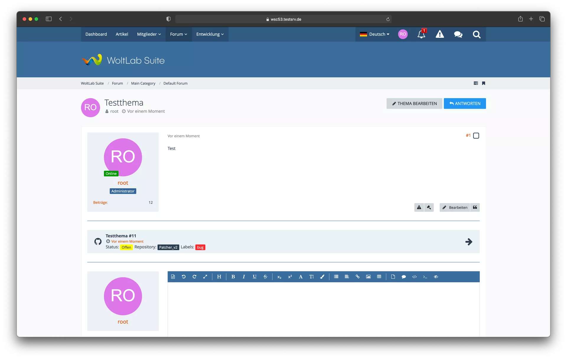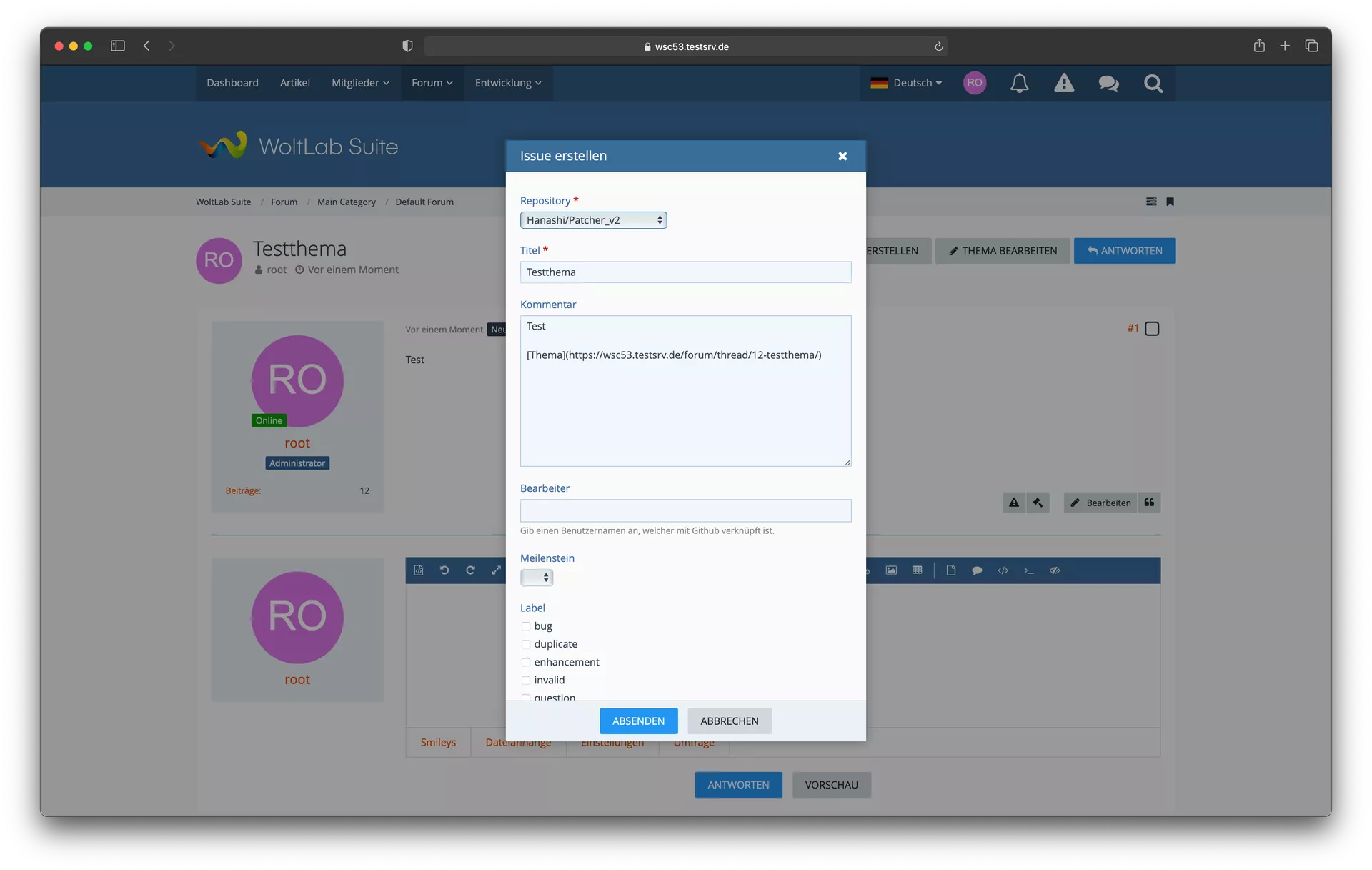 Erstelle Issues direkt aus einem Thema heraus. In Foren, welche mit Repositorys verbunden sind, erscheinen in Themen oben rechts der Button Issue erstellen. Das Formular zum Erstellen wird automatisch vorausgefüllt, kann aber durch den Anwender vorm Absenden beliebig verändert werden.