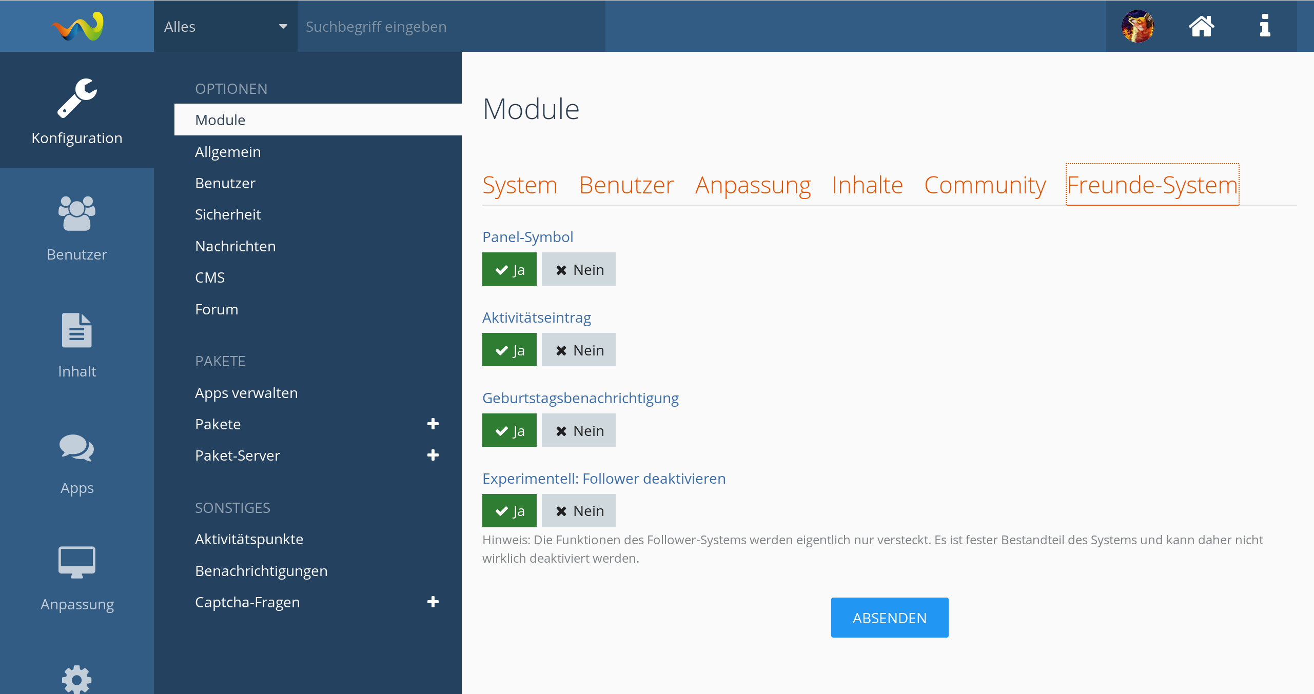 Neu (3.0.3): Das Follower-System kann unterdrückt werden. (ACP → Module → Freunde-System)